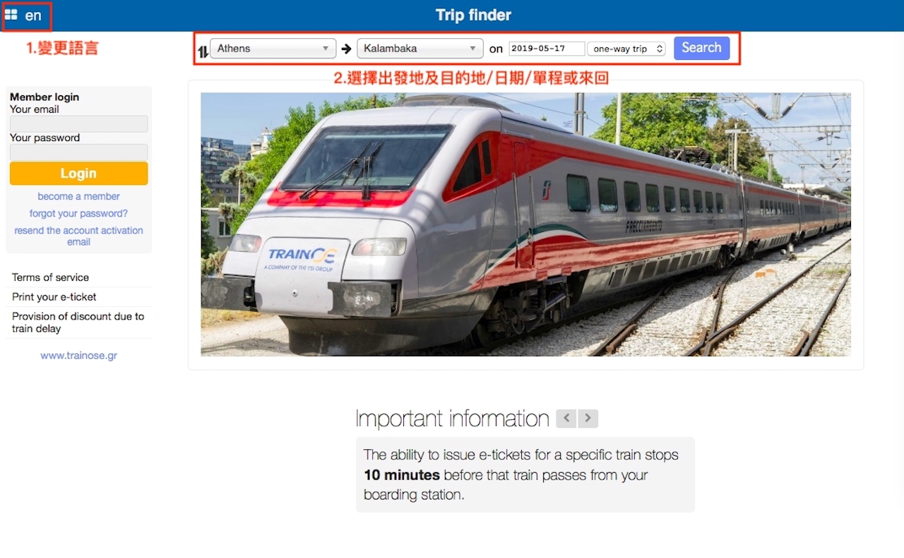 到了網頁後請先切換成英文介面(左上第一步驟),接著第二步驟輸入出發地及目的地,此篇以雅典Athens至卡蘭巴卡Kalambaka為範例介紹。