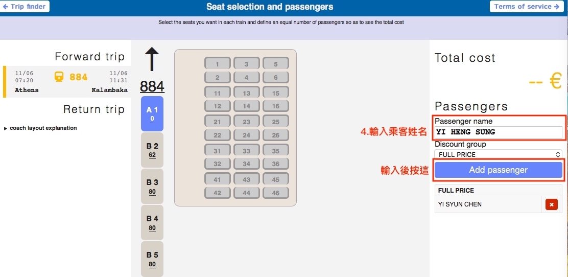 選完車次後接著第四步驟輸入乘客姓名同時要選擇座位(有多少位乘客就要選多少位子,否則是無法下一步的),可以看見有A/B車廂不同,是指車等及位子,當然票價也會稍貴一些(如上圖A/B車廂票價)。就自己斟酌囉~畢竟要搭上約四小時的車程。