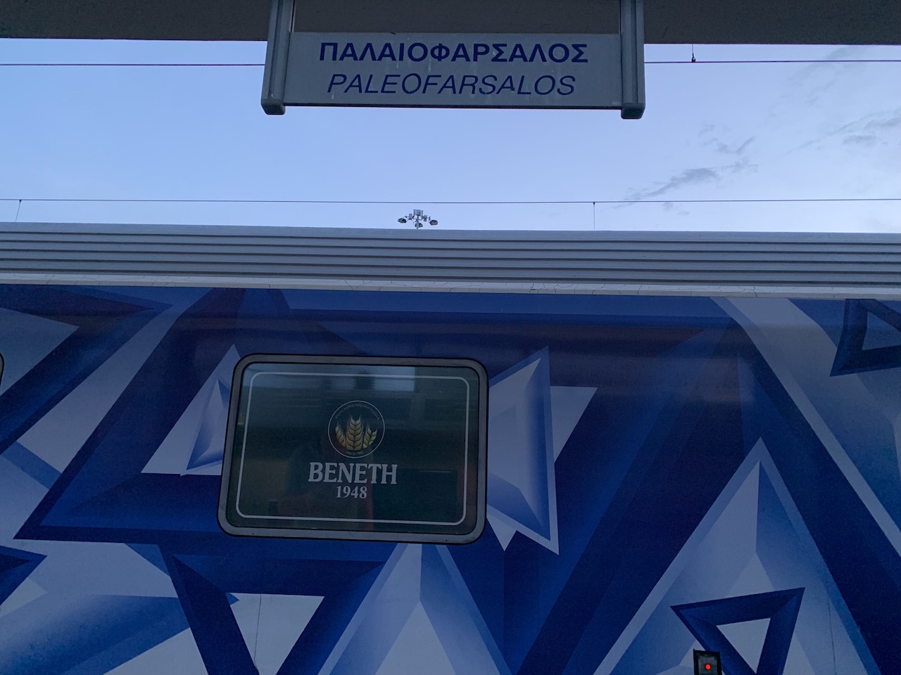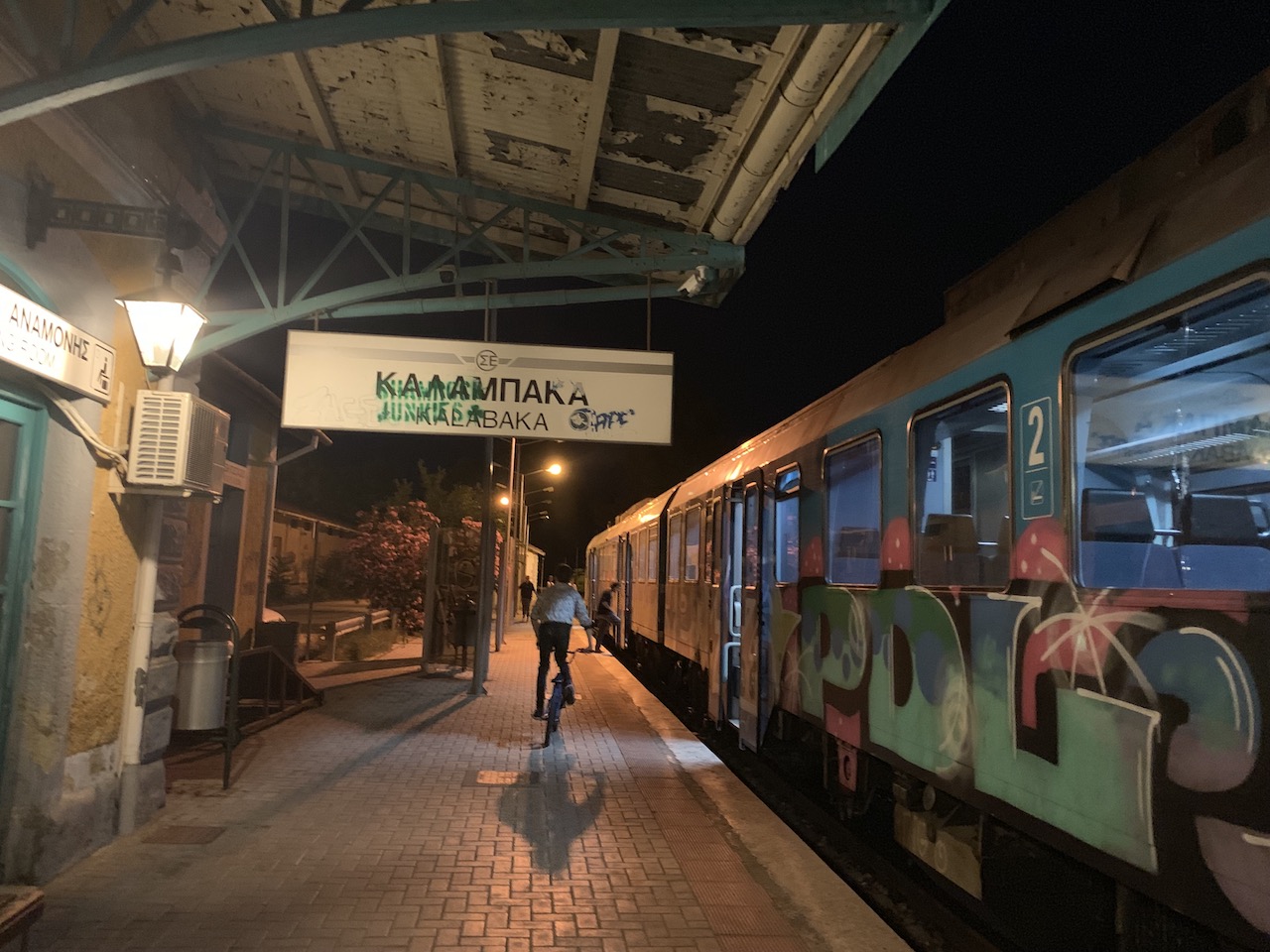約莫搭乘兩個半小時,則需再Paleofarsalos車站換下一班車。建議大家上車前就先用google map設定好這車站,再好好設個鬧鐘睡一覺,因為我當天一直不知道開到哪了,廣播又聽不太懂,行駛間網路也不是很穩,手機又處於一個低於10%沒行動電源的狀態,其實是有點擔心的,因為抵達Kalambaka後很需要導航帶領我走去hostel。最後,拿了張紙先寫下飯店地址電話以免抵達後手機整個掛點連要去哪都不知道!(第一次搭乘希臘國鐵的時候真的一個茫然,眼看時間將近應該要換車,拿起車票開始問附近的人,最後是有一位希臘女生用比手畫腳夾雜簡單英文提醒我到站了)