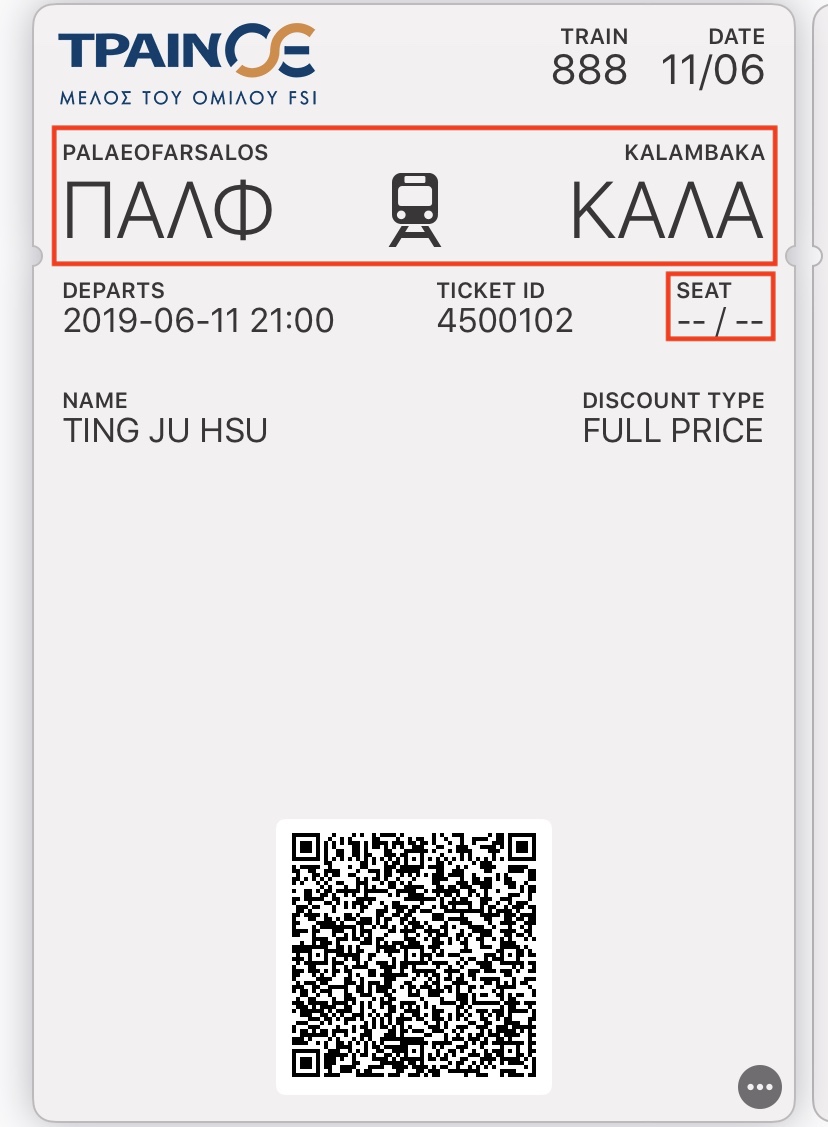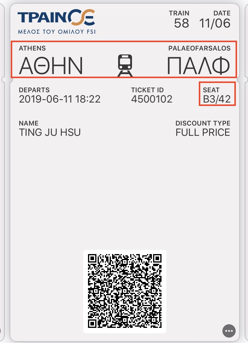下面是存在手機的電子票證,有英文的站名(方便google),但建議同時可以印出紙本也比較安全,有雙重保障!因為如果你在車上想問希臘人的時候可以給他們看希臘文站名可能比較有幫助!