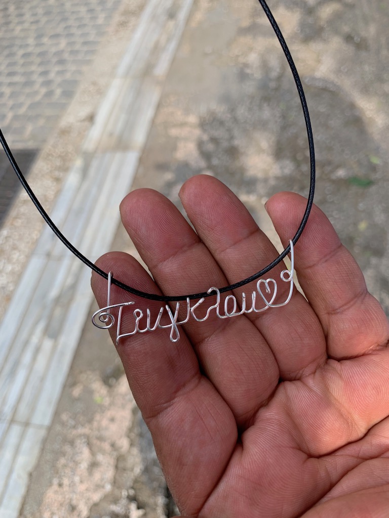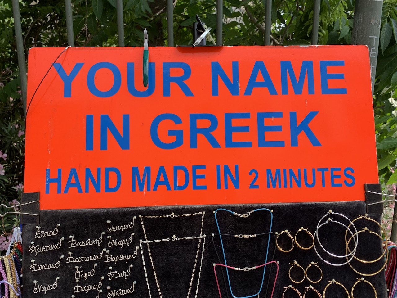 為自己做上一條希臘文的項鍊,因為看不懂所以覺得美美的,就跟外國人看中文字一樣的感覺,項鍊是自己的中文名字,幫我凹項鍊的伯伯人也很好,在製作項鍊前他會先請你寫下你的羅馬拼音然後再唸給他聽,他會寫在紙上讓你看喜不喜歡,喜歡才開始製作,大概2分鐘的時間就會製作好費用是五歐!我還請他幫我凹了個愛心做搭配~