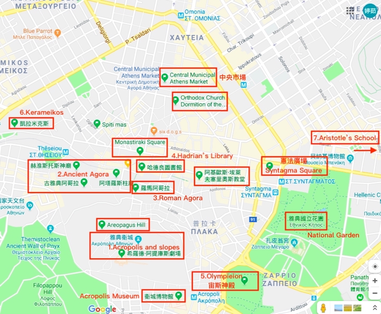 首先,了解一下雅典的各景點分布的位置,其實主要景點算密集,皆可以用步行的方式參觀,整理了兩張地理位置圖供大家參考,下圖為主要景點區的放大版,編號1-7號為衛城套票可參觀的區域!建議大家可以線上先買好票到現場掃QR code就可以開始參觀了!