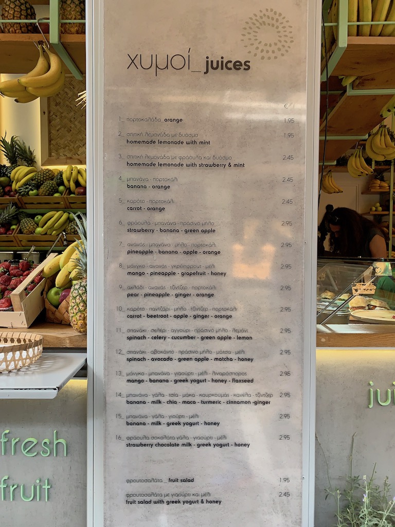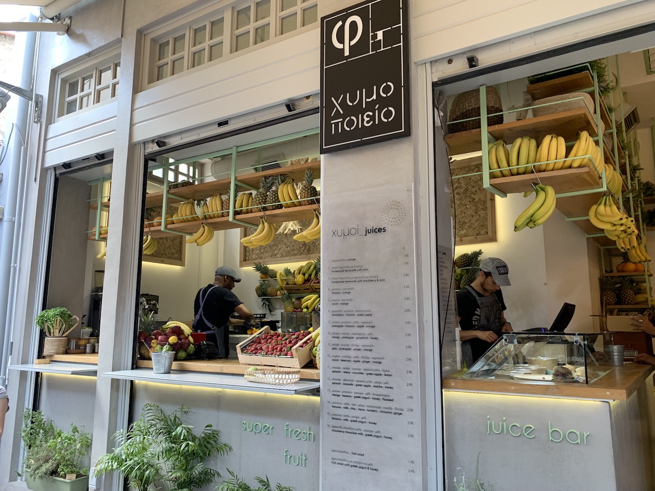另外,先前有提到希臘水果算是蠻好吃的,所以現打果汁肯定也不會差!這間現打蔬果汁的選擇蠻多的是在Monastiraki Square附近!店名Xymopoieio,店面乾淨明亮,水果擺滿滿的,直接被吸引~