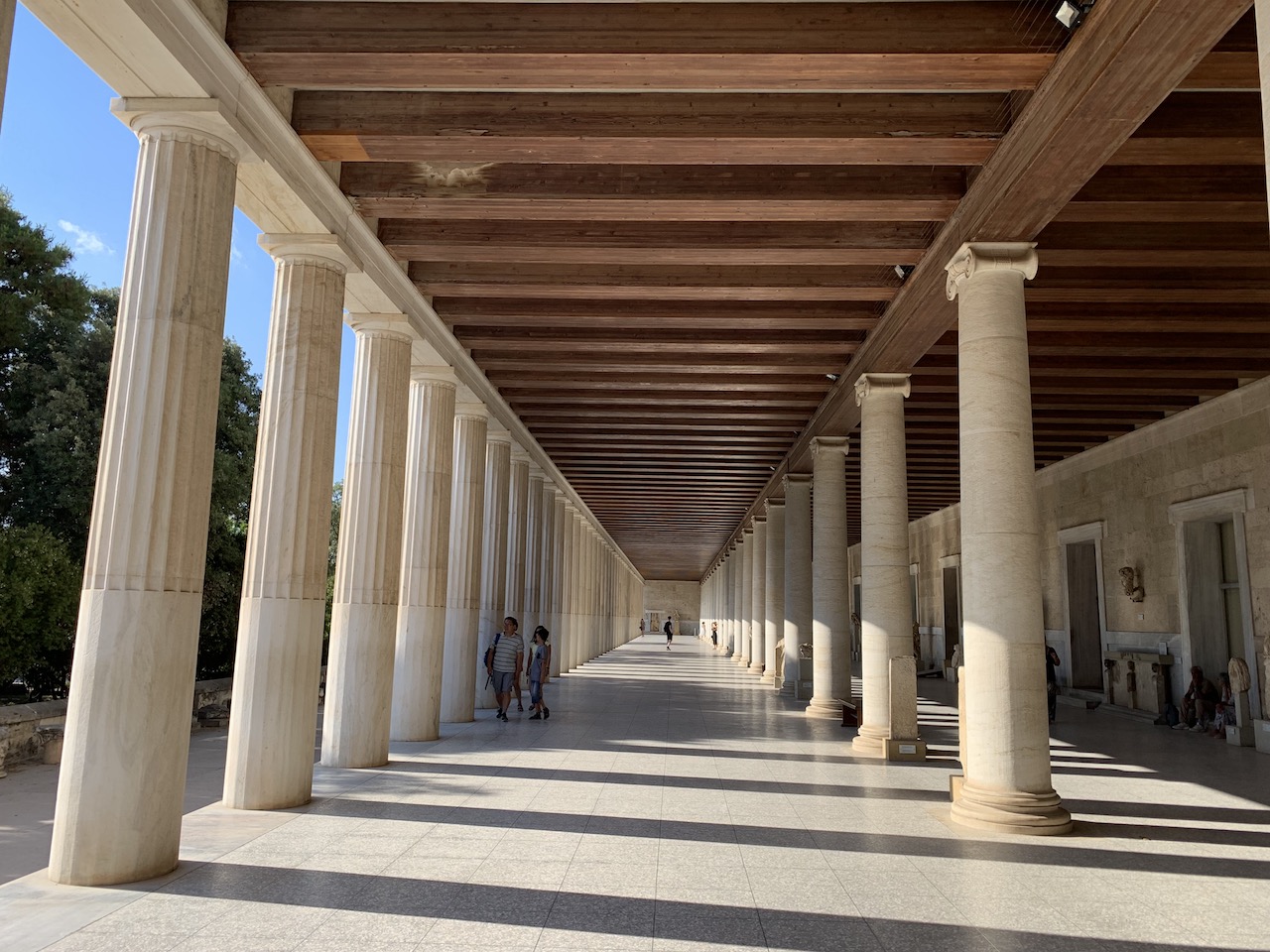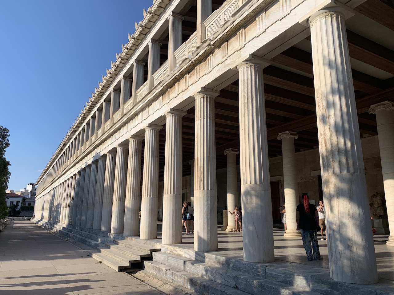 阿塔羅斯柱廊(Stoa of Attalos)因曾被摧毀,目前看到的柱廊是近代比照原設計重建(1952-56),所以保留得相當完整,廊柱的外層是採多立克柱式,內層則採愛奧尼柱式,雖然是重建的但還是很有穿越時空的感覺,畢竟修復古蹟或重建都是一件耗大的工程,也有很多地方其實都無法被修復或正在施工中(無止盡),所以能親眼目睹這壯觀的柱廊還是很感動的!