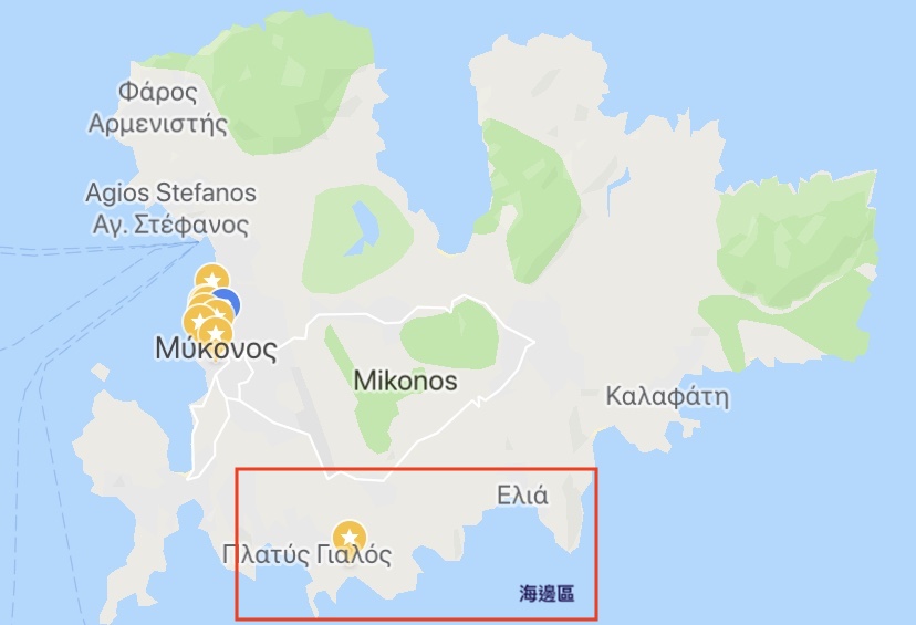 而知名的Paradise Beach是位於下面紅色大框的海邊區!除了天堂海灘外其實還有很多其他的海灘可以去拜訪~