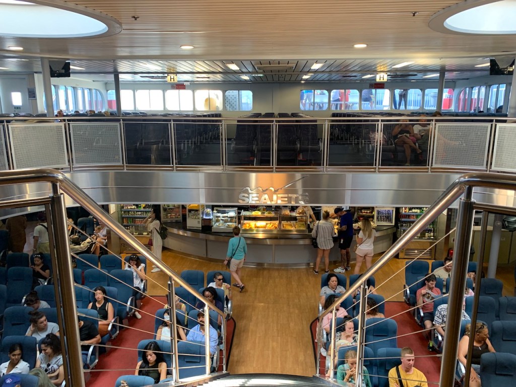 船上分很多區,要照自己購買的區域入座,不過如果在同一區其實沒坐滿換位也沒關係,行李會在一開始登船後就要存放在底層的區域,雖然有很多層架可以放,但如果不想放到太偏遠的地方建議不要太晚去排隊,船艙有販賣部,但建議自行帶上去吃即可,選擇性較多又便宜呀。