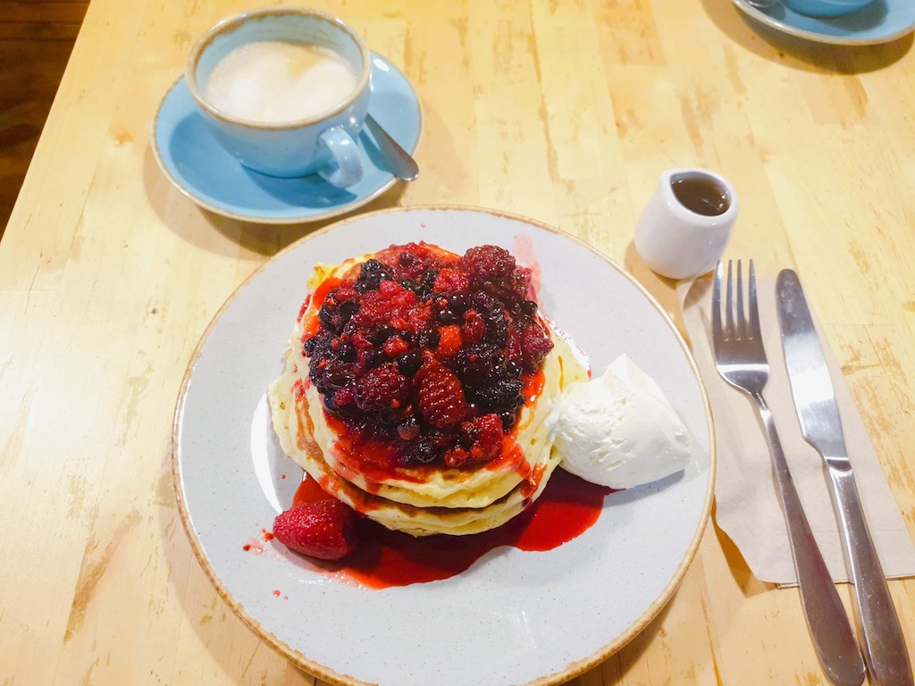 朋友們點的都是美式鬆餅,鬆餅的厚度算中厚,沒有像舒芙蕾鬆餅那樣的澎鬆,但口感及份量都很足夠,莓果的這份,微溫的綜合莓果配上不油膩的鮮奶油及楓糖,推薦給喜歡微酸帶甜的你!