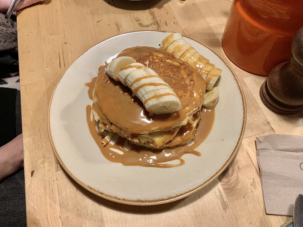 香蕉鬆餅就如圖所示的簡單明瞭囉!焦糖醬不論是色澤及味道都可以給高分~