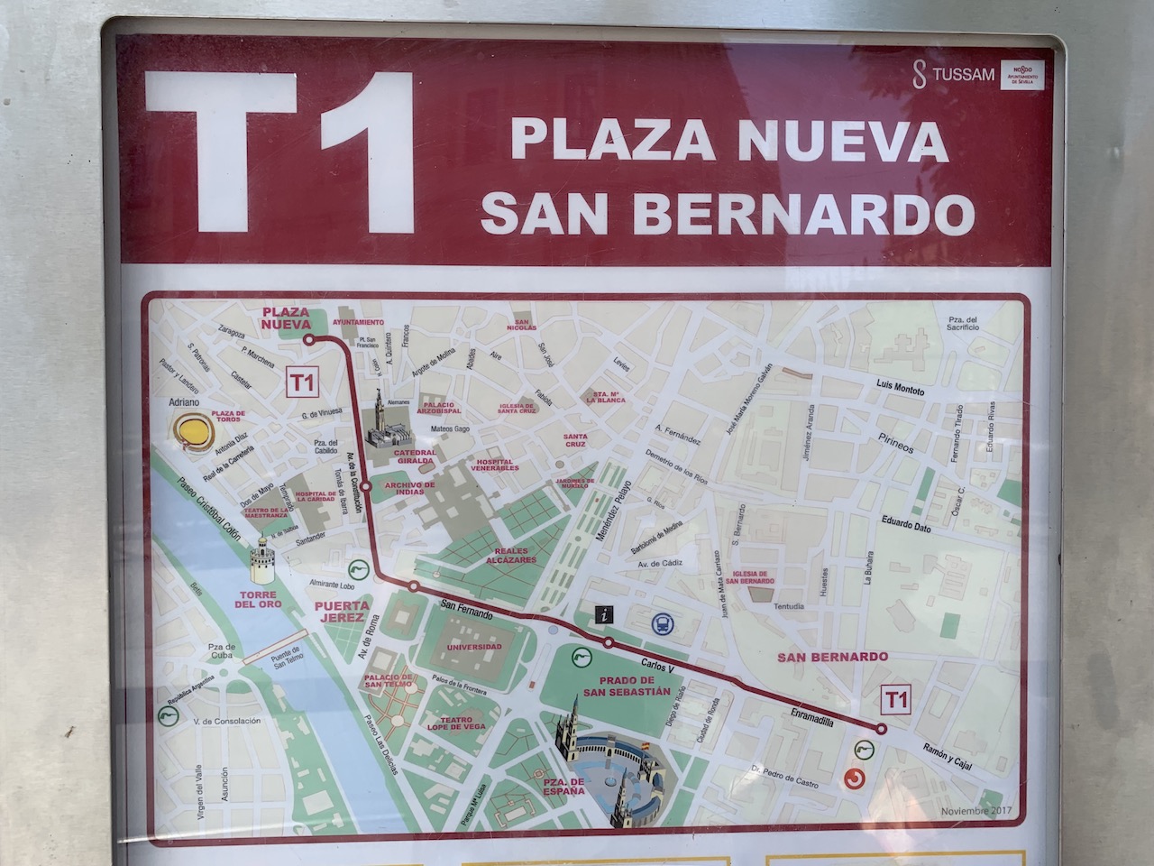 如果懶得在烈日下走路的人可以考慮搭路面輕軌(TSUSAM)喔!很快速又方便,輕軌車箱很乾淨明亮,節省時間外可以順便欣賞街景,但其實塞維利亞的主要觀光景點蠻集中的,都是步行即可抵達的距離,真要搭車T1這路線大概就可以滿足需求喔!
