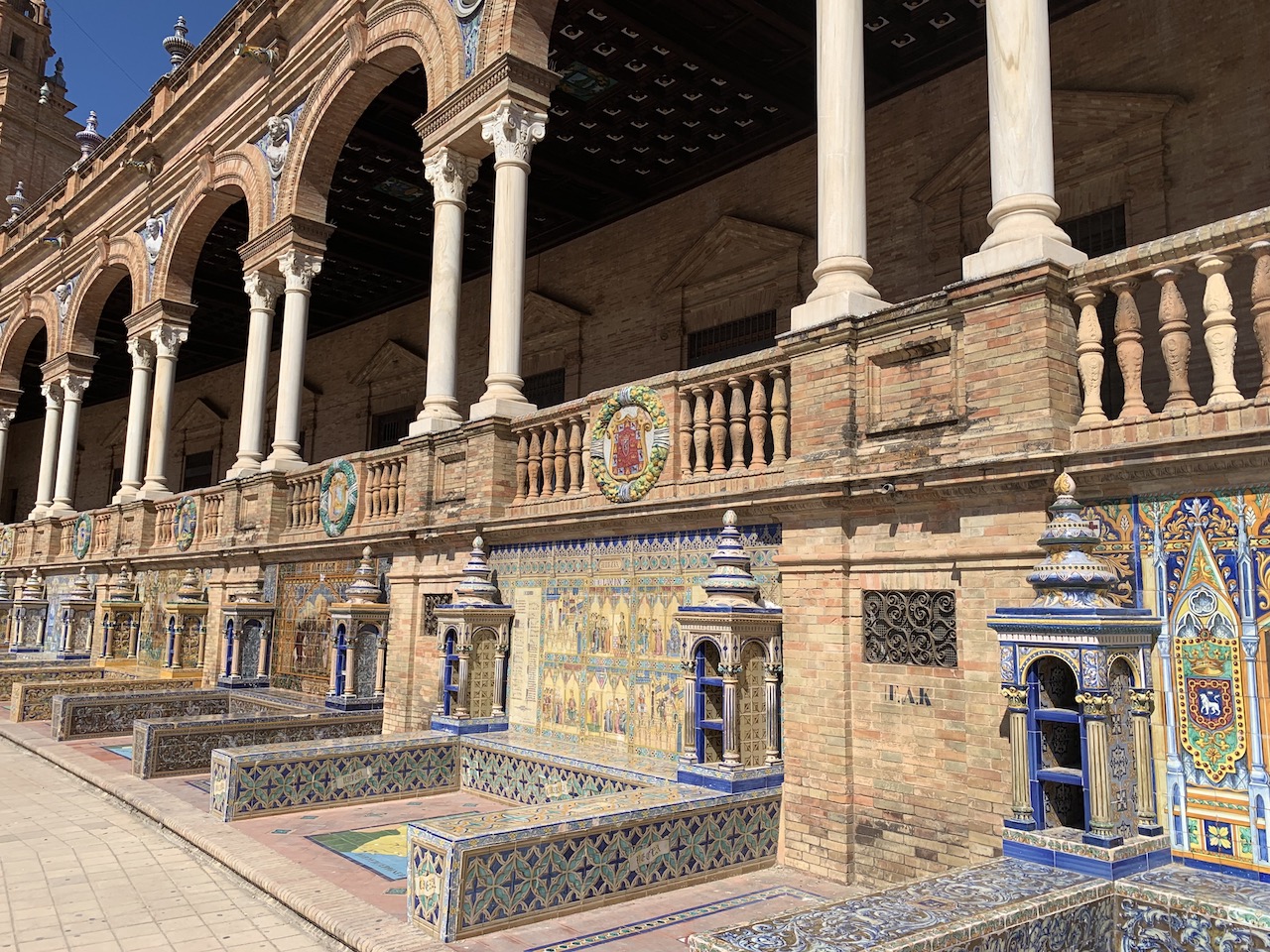 此處另一個令人著迷的地方肯定是沿著這半圓形的建築物外牆的花磚藝術,每一格都代表的西班牙的一個省份,地上有省份地理位置的磁磚而牆上則是一些歷史故事,查了資料才知道原來每一格兩側那造型是書架,通常存放當地省份的資訊。