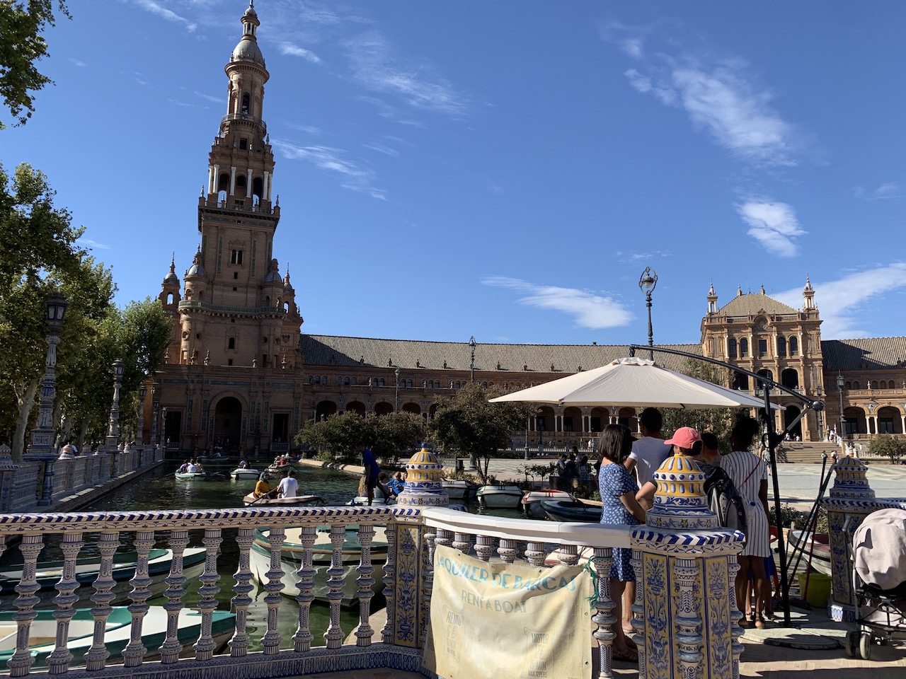 穿越噴水池走向瑪麗亞路易莎公園(Parque de María Luisa)前,就會看到有一座陽傘處,此處正是購買船票及乘船處,有一般的手划船是35分鐘/6歐/上限四人,電動船則是15分鐘/12歐/上限12人。