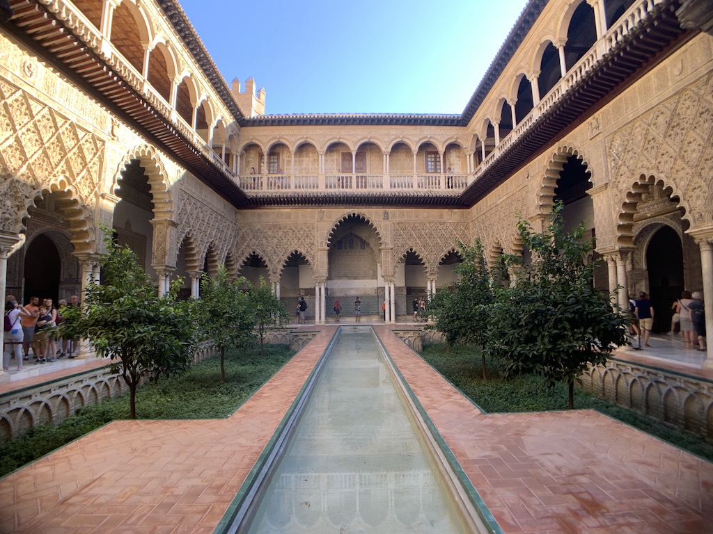這是一座穆德哈爾 (Mudéjar)風格的王宮,混合了基督教以及伊斯蘭教的建築風格及工藝,並於1987年被列入世界文化遺產,比起金碧輝煌的王宮,這裡更令人陶醉的絕對是牆面雕刻,另外還有捉摸不透的磁磚牆,可惜受過地震及歲月的影響,有些許斑駁及修復的痕跡,戶外的花園景觀區更曾是權力遊戲 (Game of Thrones)拍攝的片場之一呢!