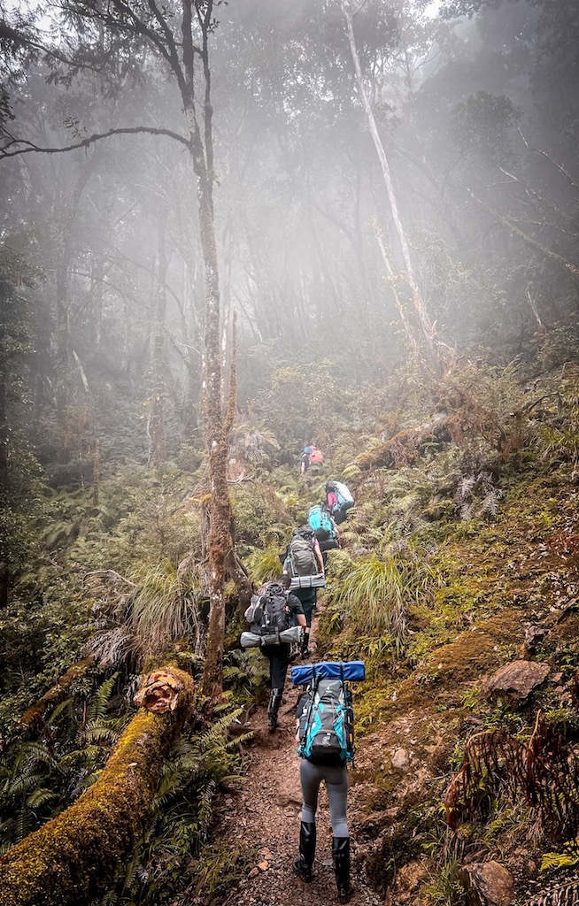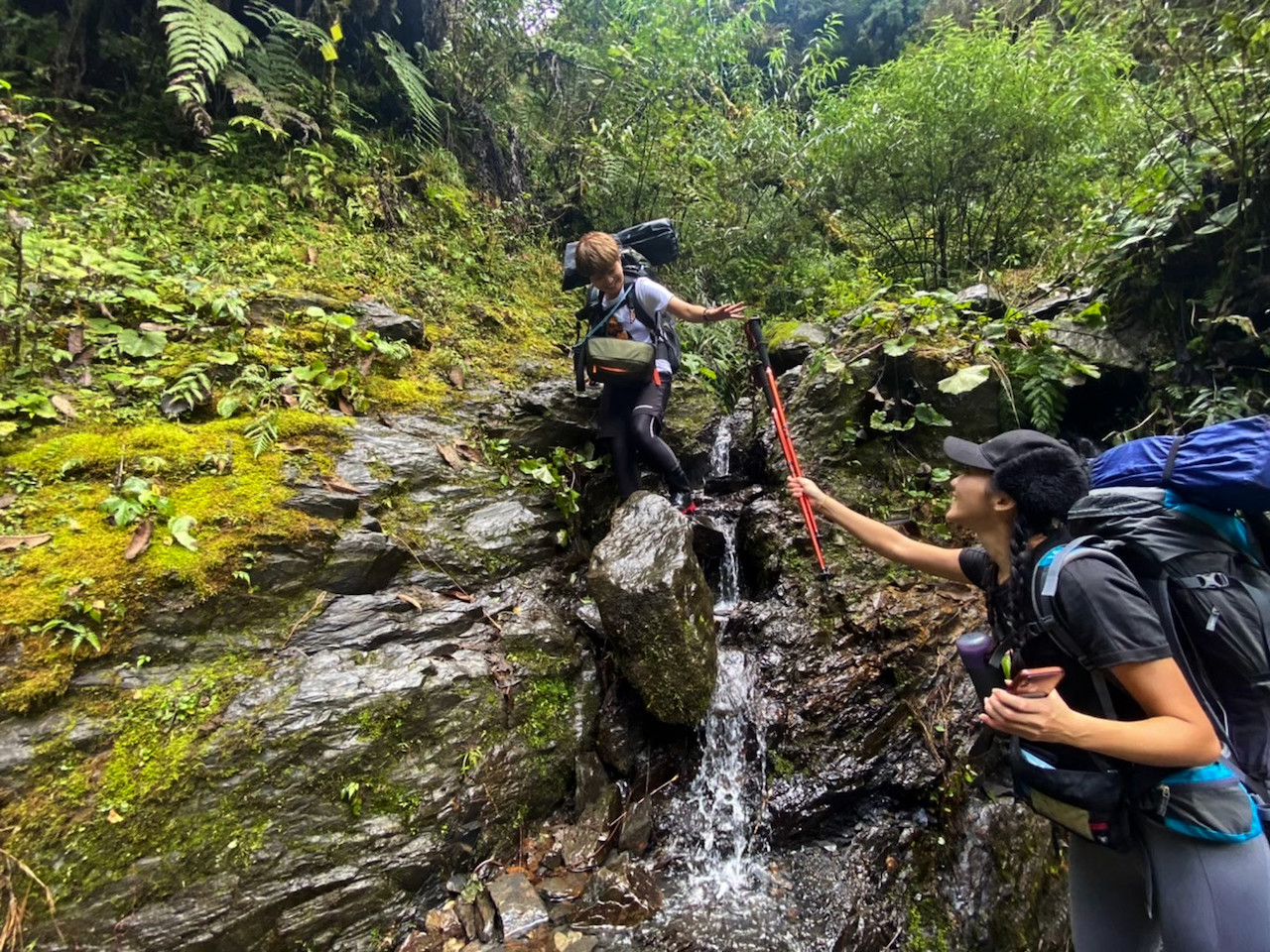 大家小心翼翼沿著溼滑的大岩塊下切再穿過溪流到對岸,此時,真的萬幸選擇穿了雨鞋上山,出發前還擔心從未穿過雨鞋長時間登山,怕腳會不適應,沒想到搭上護踝走起來其實比想像舒適且穩。