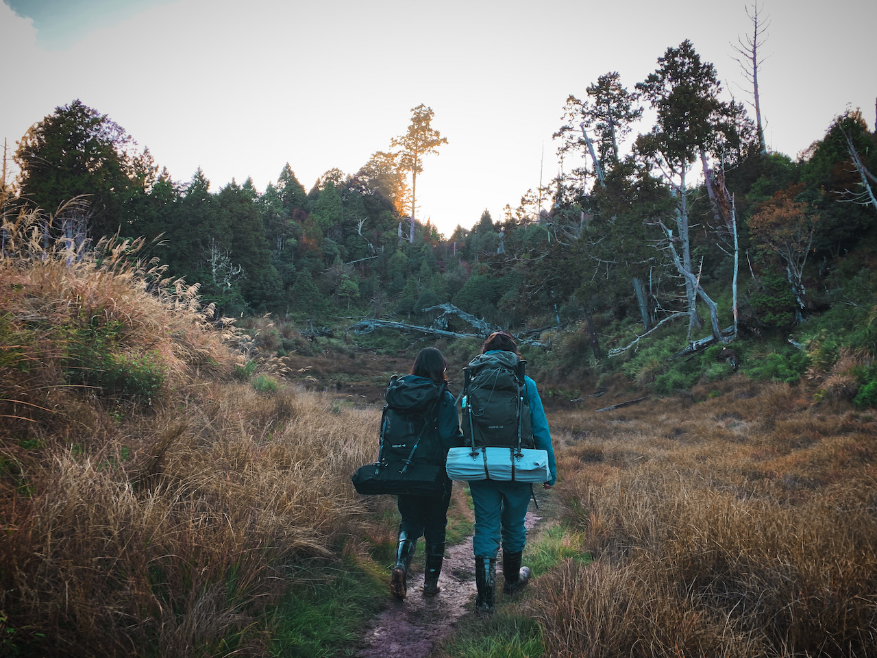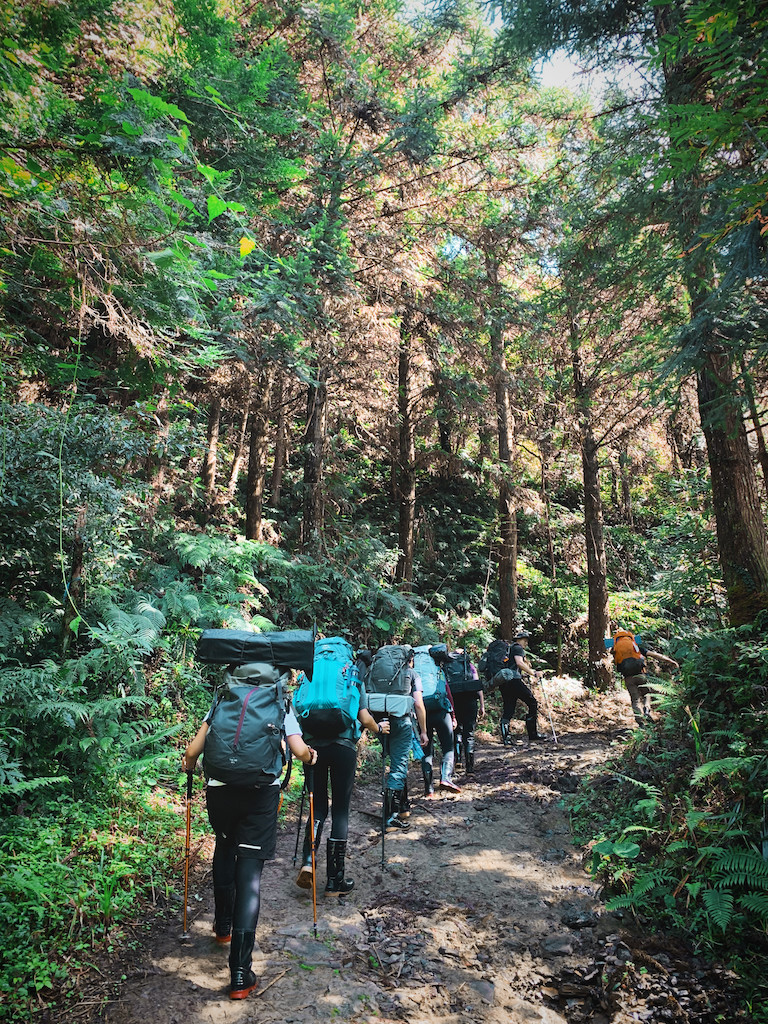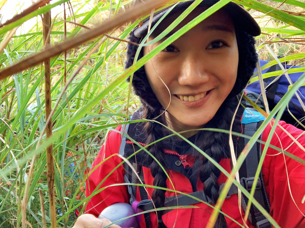 芒草箭竹區真的是沒在客氣地長很高很茂盛,我們一路人由嚮導帶隊,用雙手撥開擋住視線的芒草,報數著也跟緊著腳步,看著隱身在芒草堆或泥濘下的紅色尼龍繩前行,沿路喊著一根大棒棒(?)小心爛泥等等提醒著後方友人。