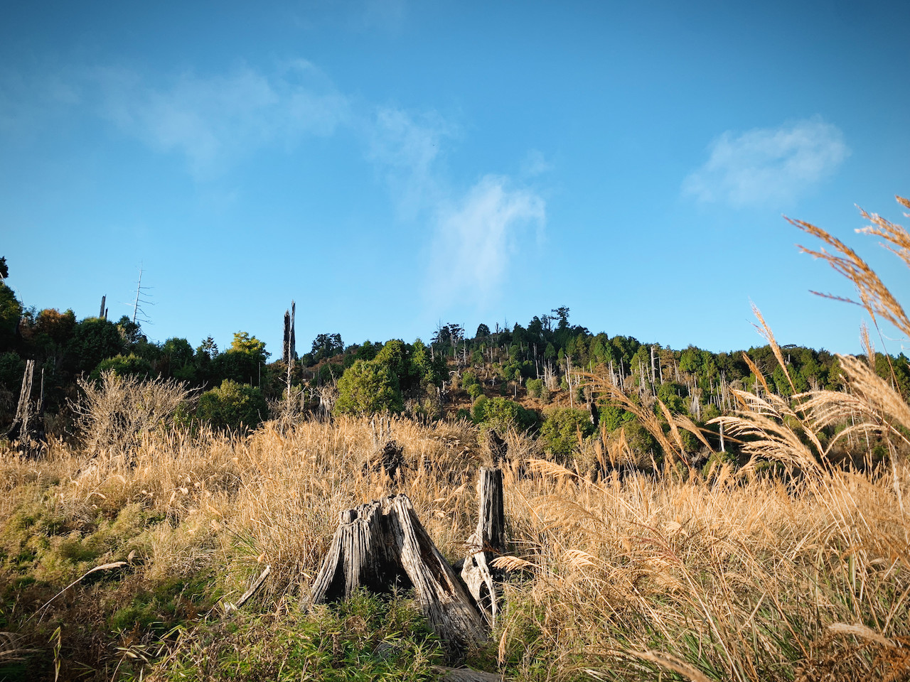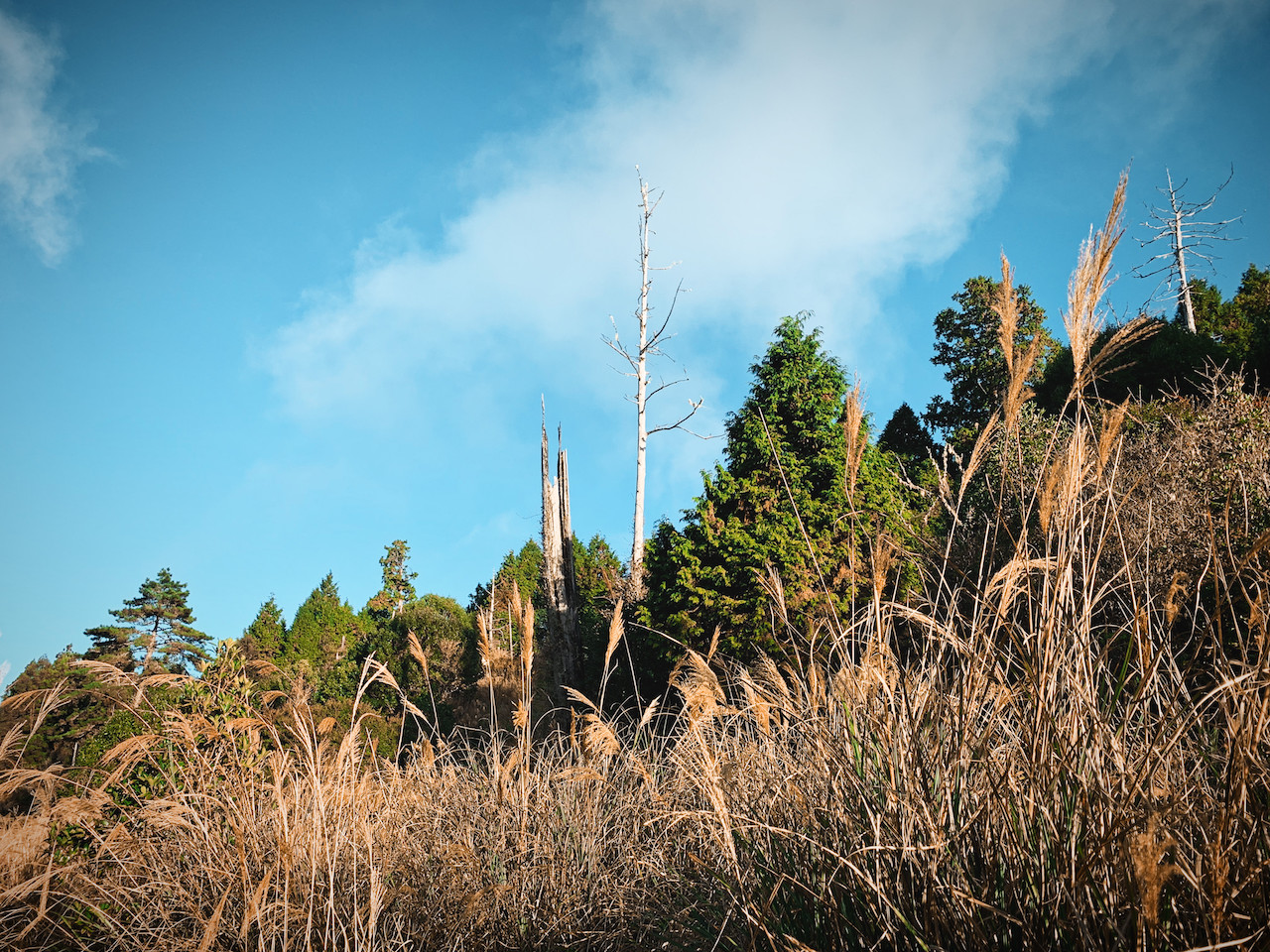藍天、白雲、芒草、陽光、枯木,一下子太美太美了吧!