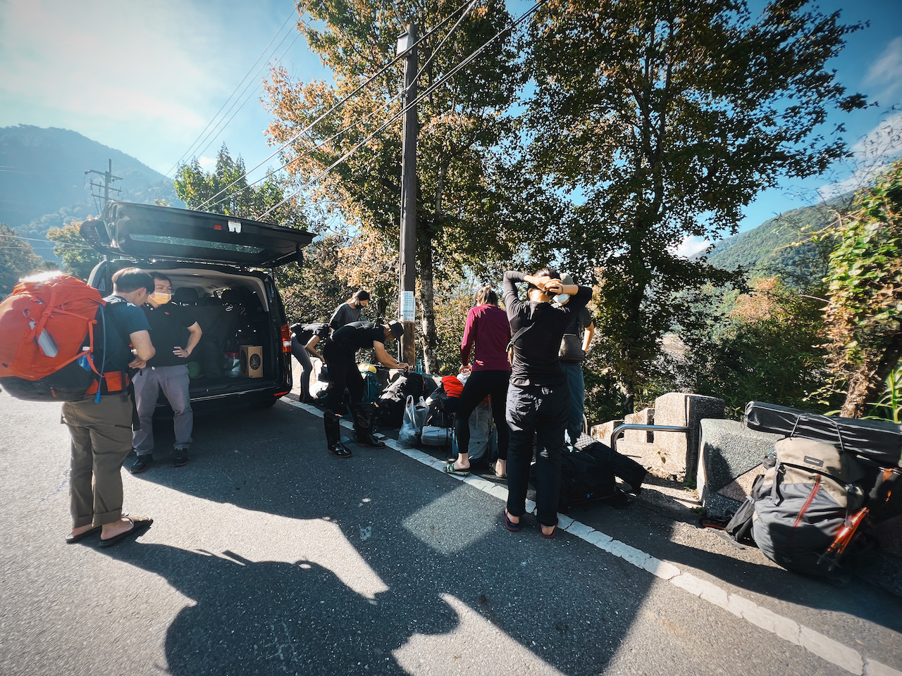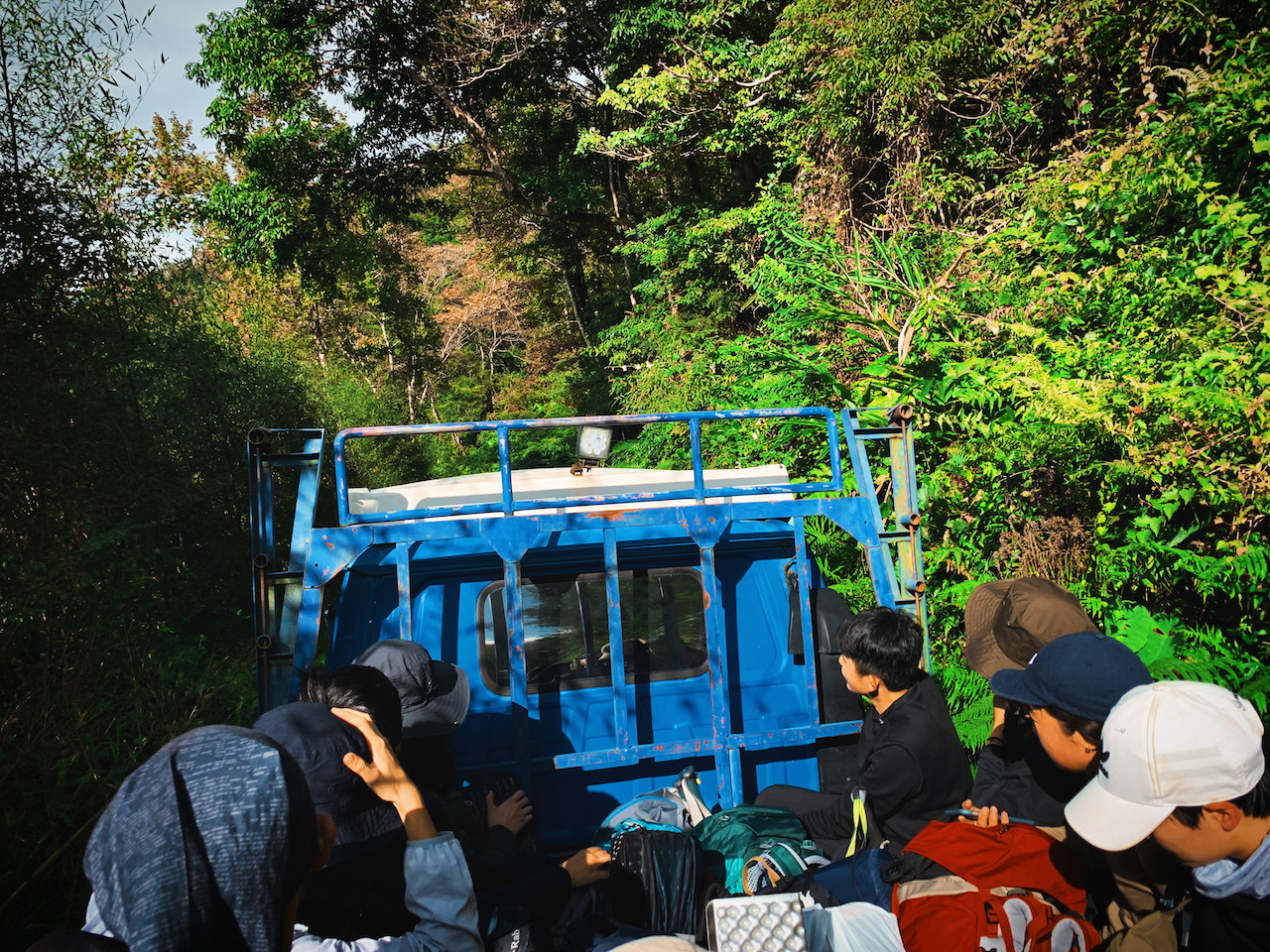 搭乘9人小巴從台北來到了四季國小,一行人開始卸裝備整裝穿上護踝,雙腳咻咻兩下滑進雨鞋,等著可以帶我們抄捷徑偷懶的當地菜車來接我們去傳說中的紅柵欄登山口,菜車熟悉的在產業道路穿梭,在各個過彎、加速爬坡、煞車之際,讓化身為高麗菜的我們使命的互相倚靠抓穩抓牢著!蠻刺激也hold得有點辛苦啦~